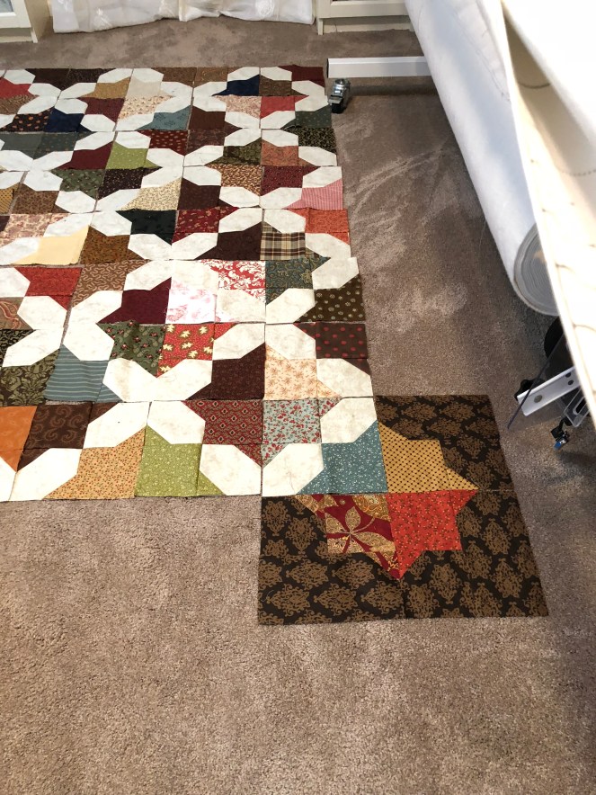 Adding new fabrics each time I get a few blocks sewn up. At this point in my process I had not decided how big the quilt was going to be. I needed to lay it on the floor and get a feel for things.