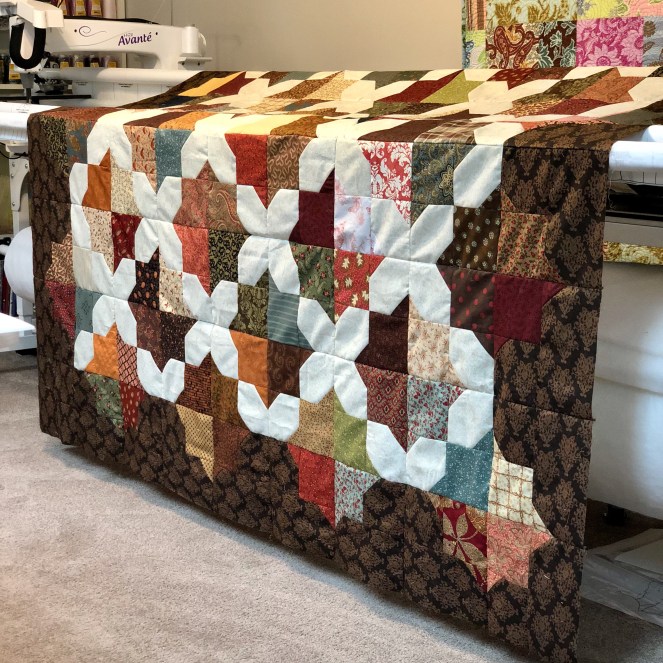 I spent one month completing the quilt top. In a future blog post I will show the quilting process. I can’t wait to snuggle with this fun fall quilt all winter long. I’m sure the snuggle time will start while hand stitching the binding. I wont be alone for that task. My Yorkshire terriers are sure to join me.
