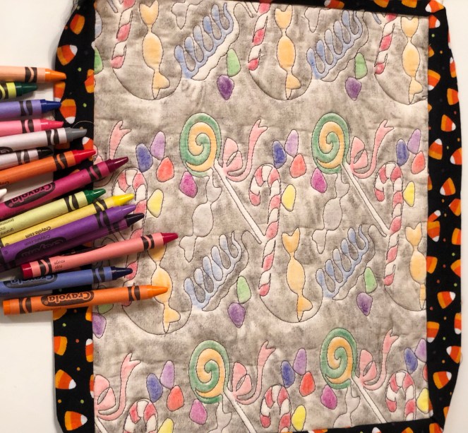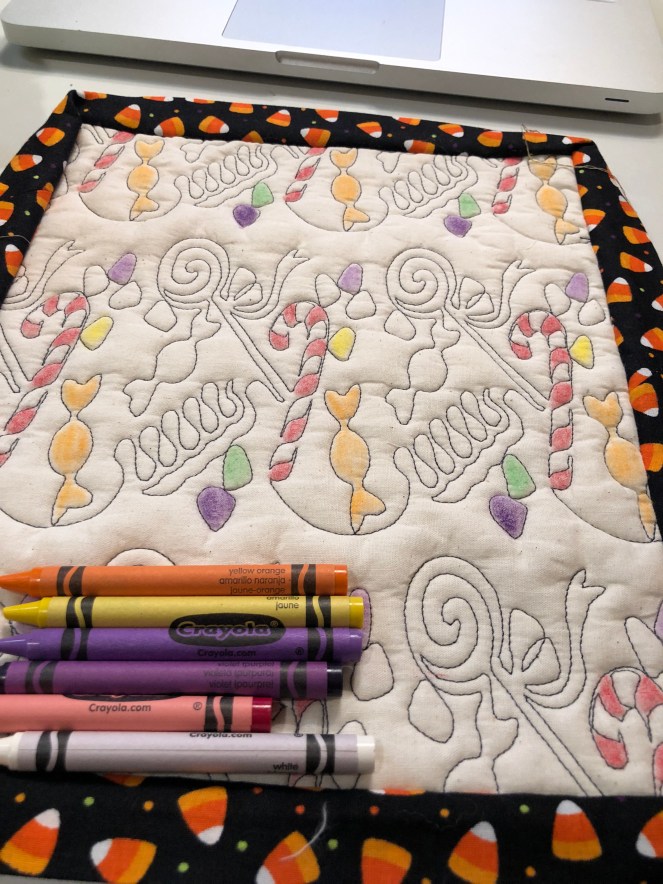 In order to mimic old-fashioned coloring book pages, I outlined the designs in black. I chose black 40 weight thread to stitch out three digital quilting designs. The plan was for my guests to color the mats with crayons then heat set the colors.