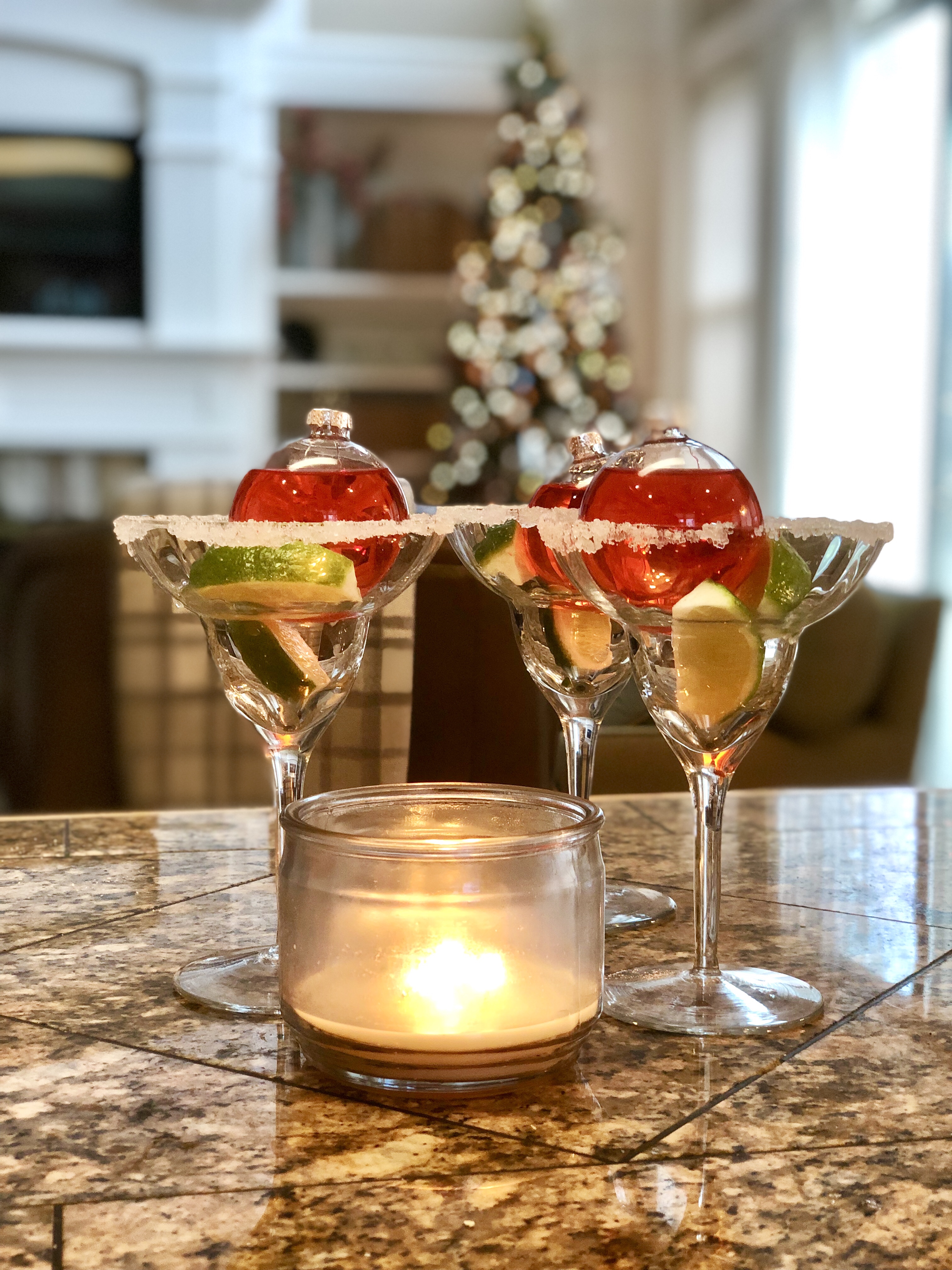 A glass that fits and shows off your ornament. I used margarita glasses.