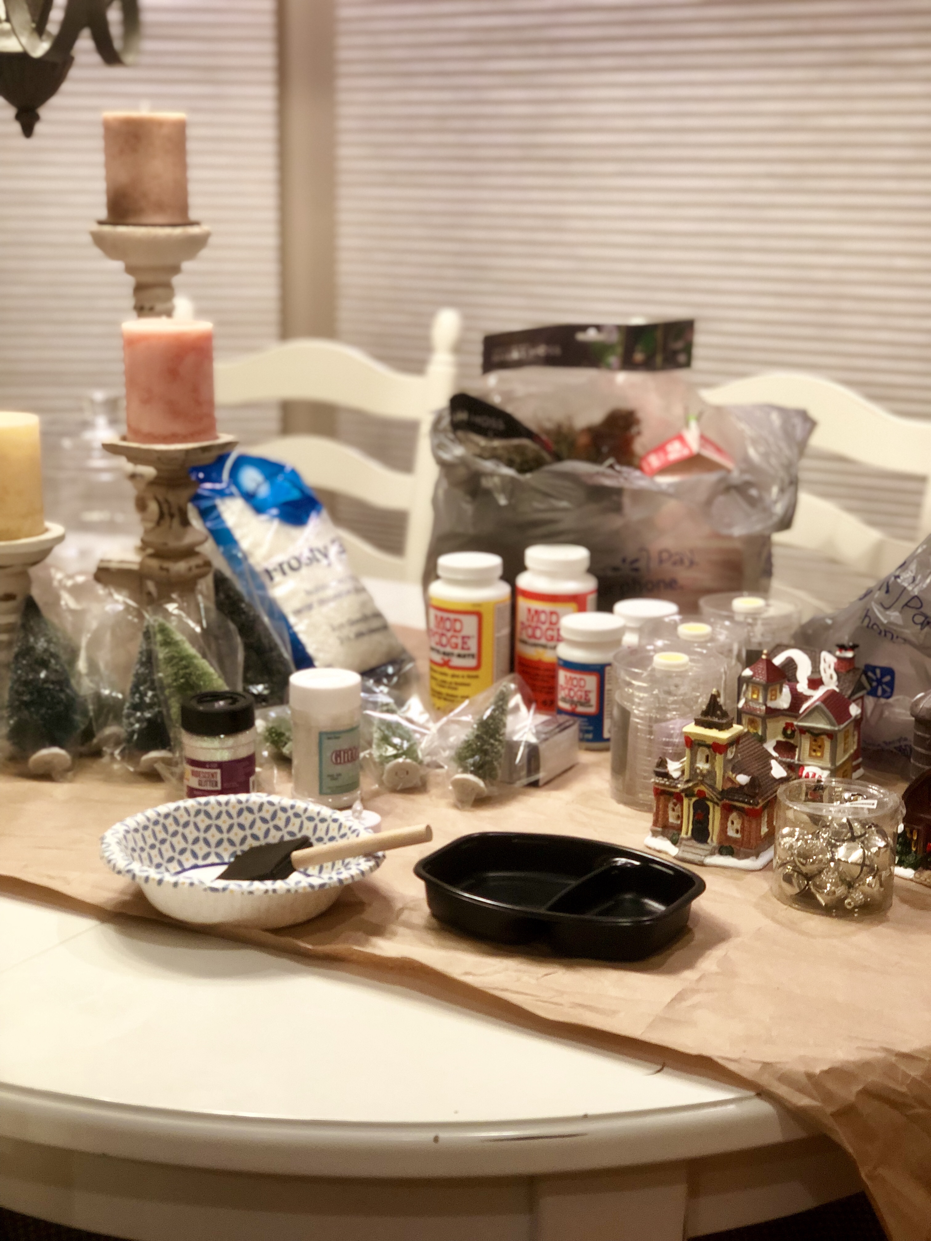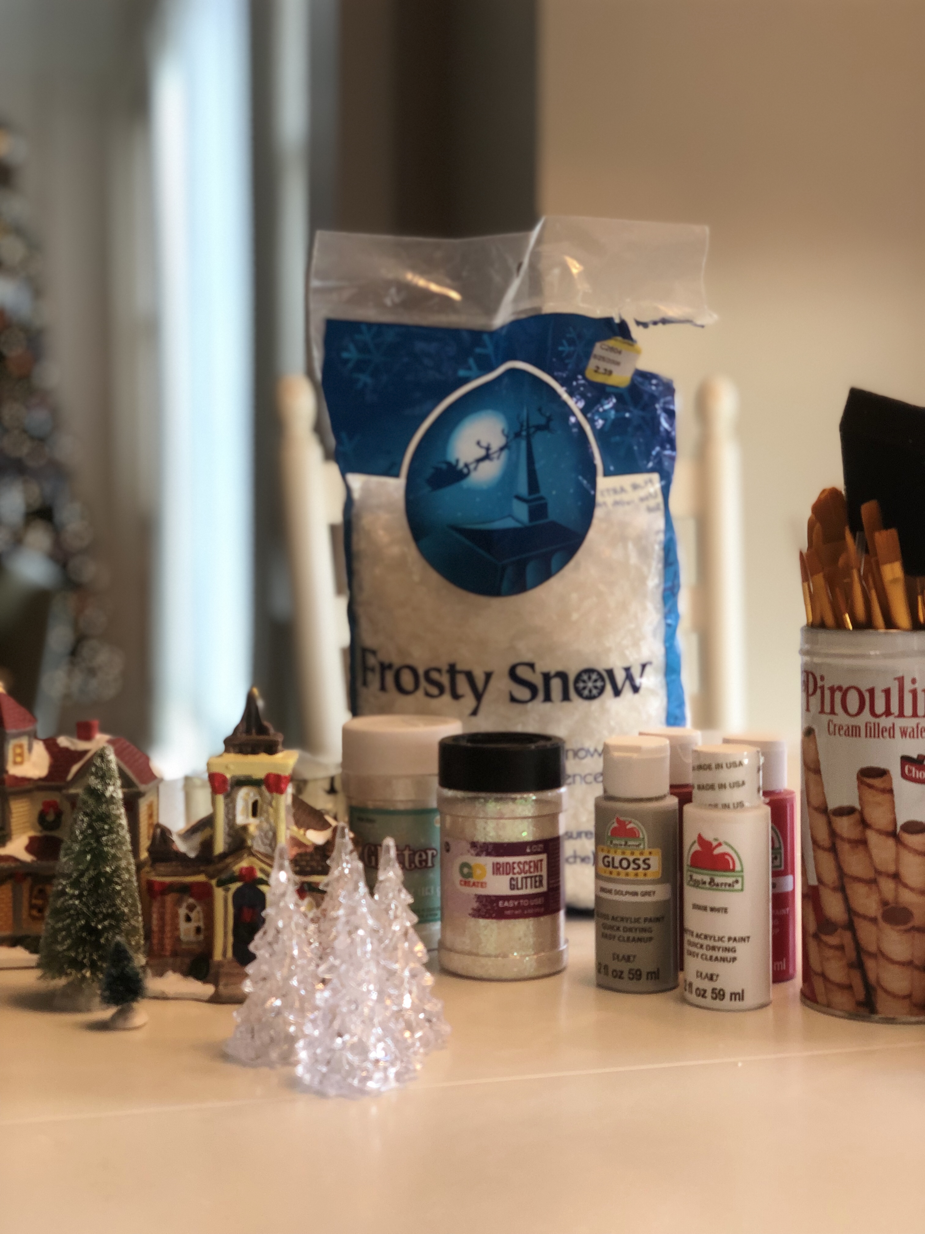 Paint, Mod Podge, little village houses, lights, clear plastic trees, bottle brush trees, sparkles, paint brushes, foam brush, bells, string, moss, epsom salt for snow to name a few.