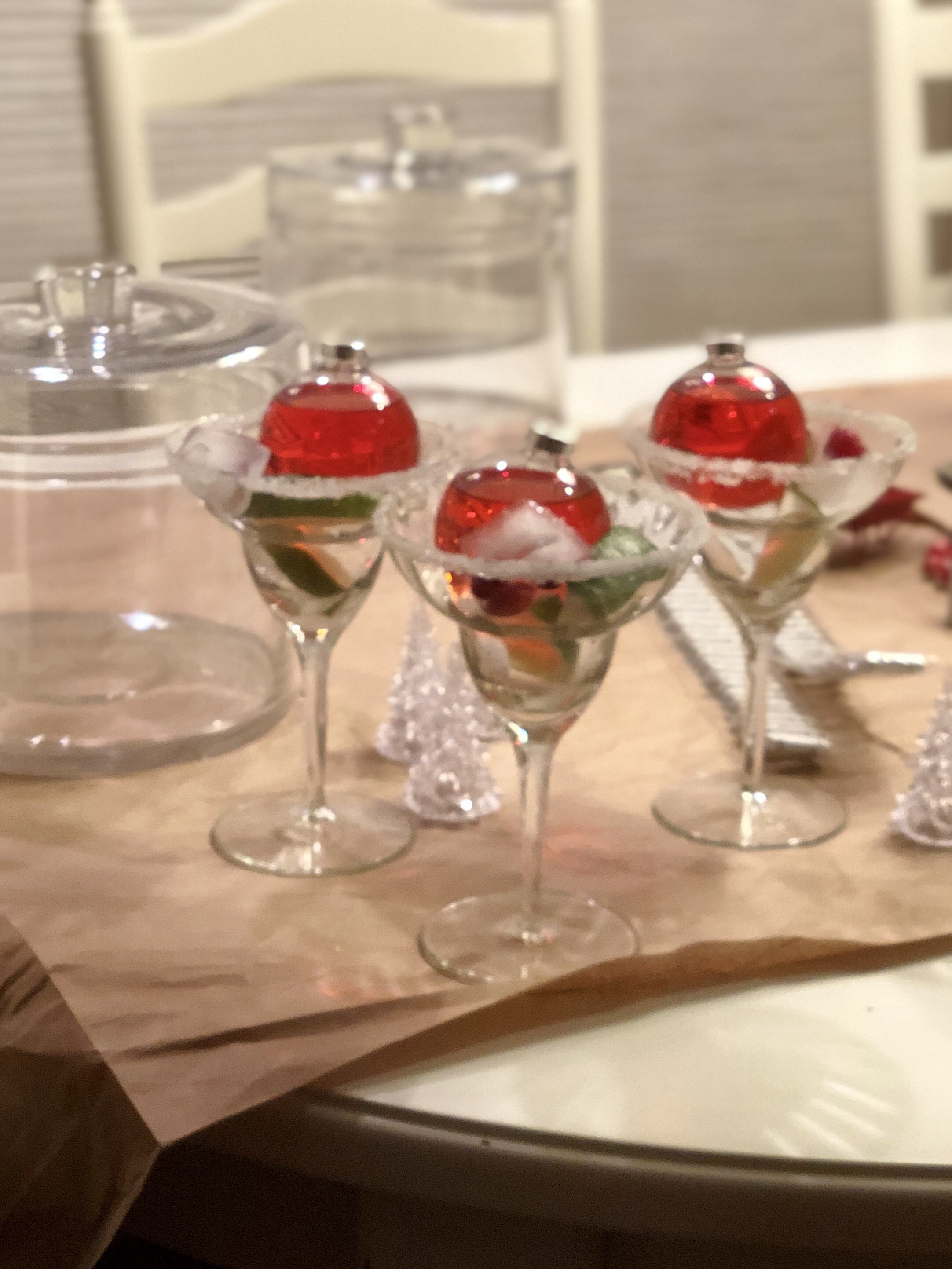 I poured the vodka and cranberry juice in the ornament and set in chilled margaritas glasses that were rimmed in sugar. Each glass contained 2 slices of lime and cranberry ice cubes. After presenting the glass to the recipient, the recipient pours the ornament into the glass and tops off with ginger beer.