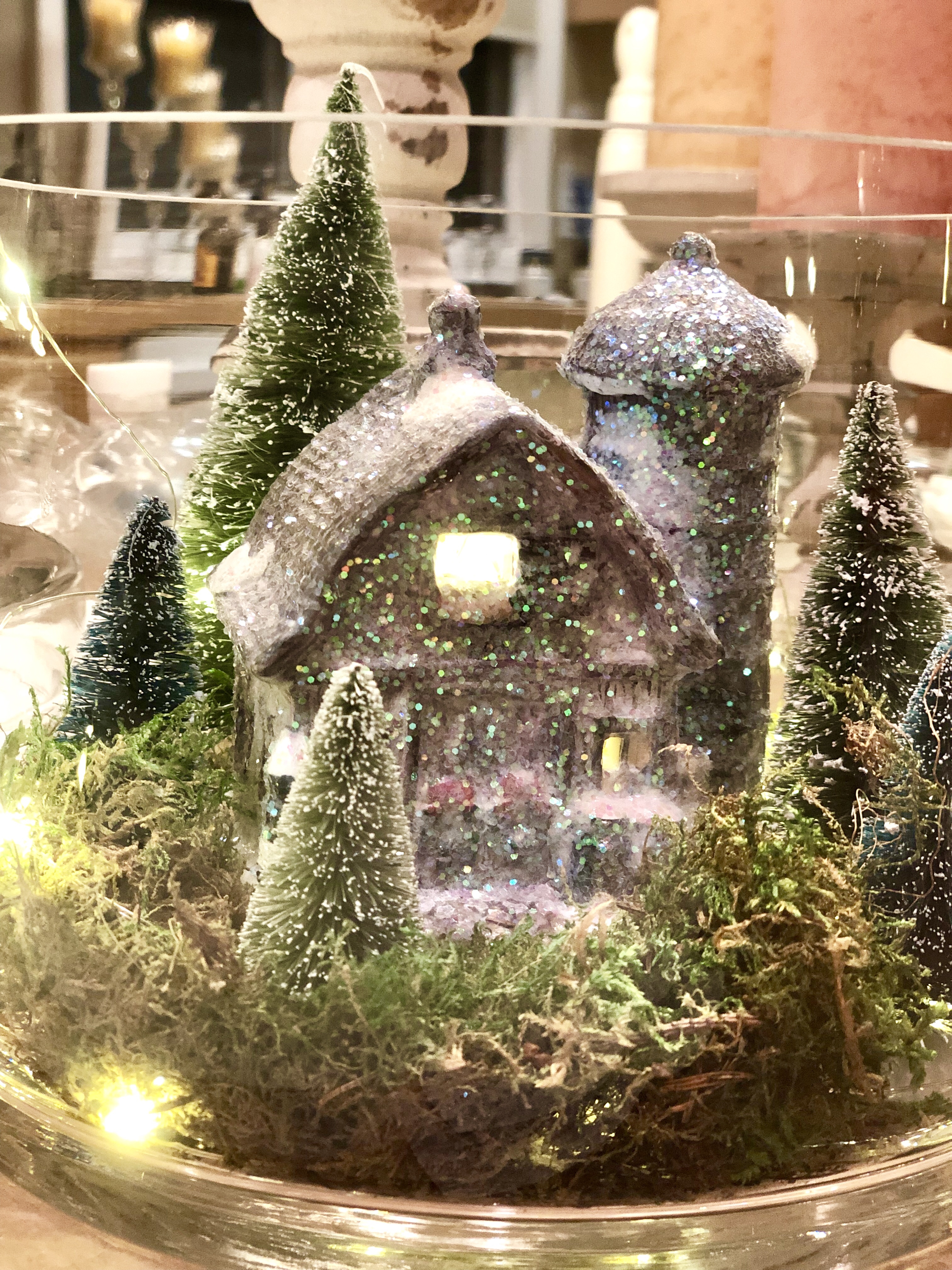 You can see the brightly painted inexpensive village houses that I used for the project. I whitewashed the house to give a frosty appearance.