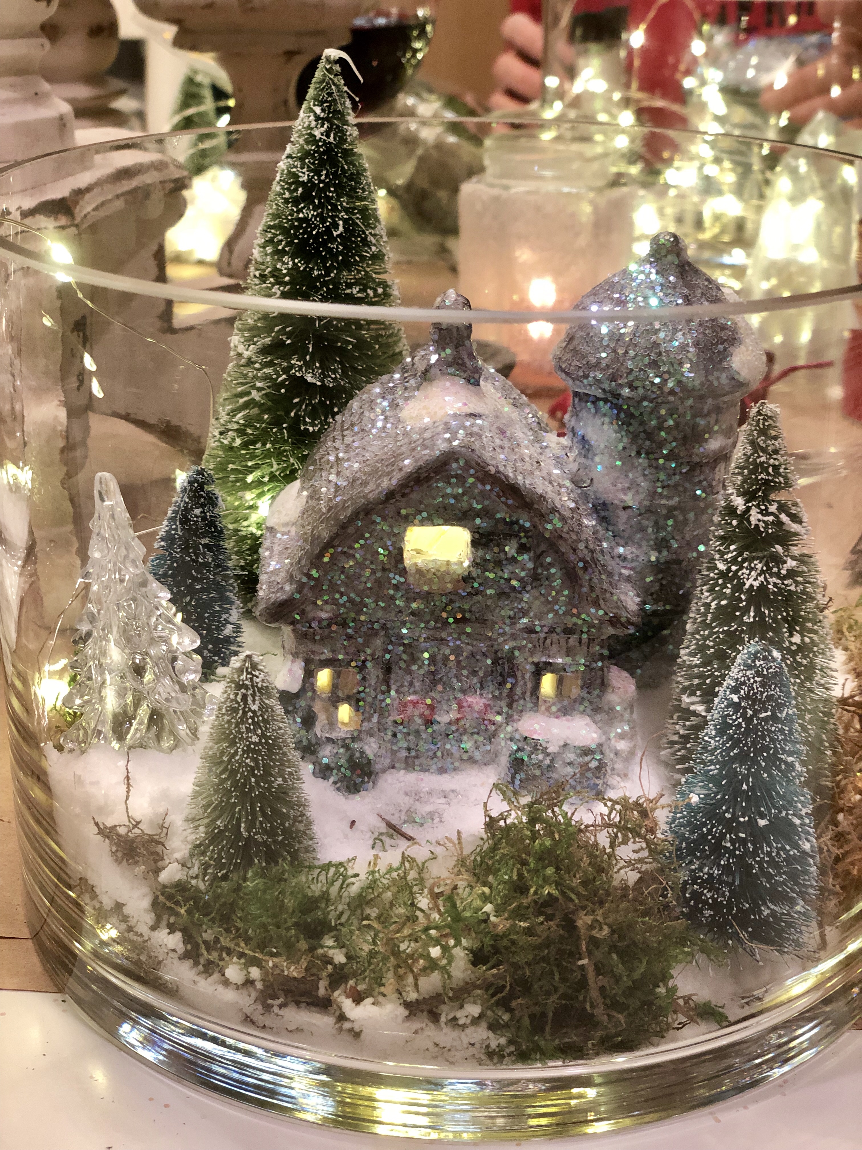 The village scene under glass was a hit with my girlfriends Karen and Jody . They had a great time painting and creating a vignette that suited their imaginations. We listened to Christmas music had wonderful appetizers and wore pajama’s  and slippers!
