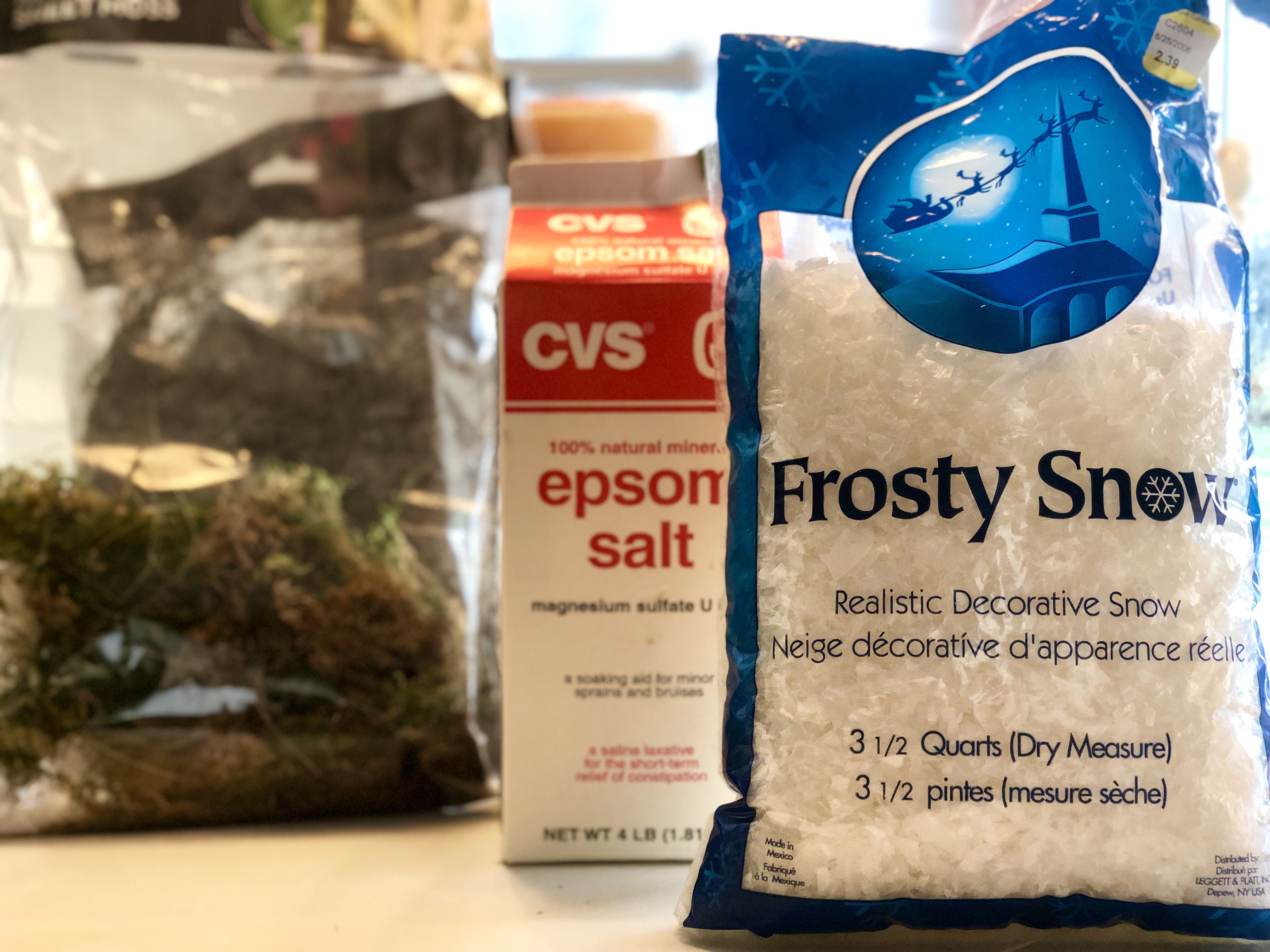 My best options for snow were epsom salt and Christmas village snow that I had from years past. I also pulled out sheet moss and sphagnum moss for the bottom of the jars. I liked the idea of layering my winter scene.