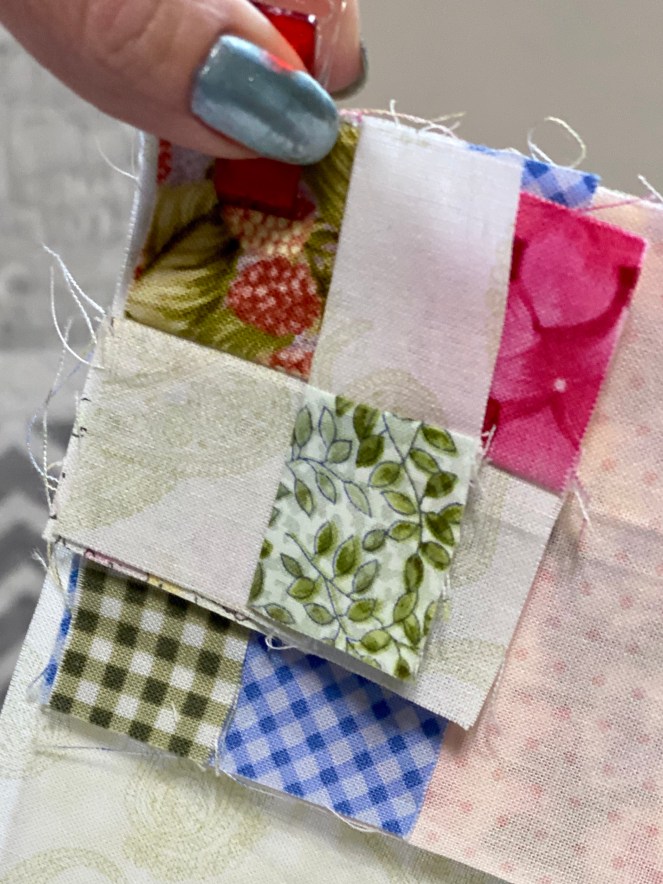 We all have our own creative process. For me, color and fabric are the spark to my creative plan. I’m called to color first. Then I find a pattern that will enhance the fabrics that I picked. It takes time to come up with the right project and sometimes months go by before I make all the decisions and complete something. Since I usually buy fabric, and then find a pattern, I don’t always have enough fabric to complete my project. That’s a problem. My tip is to collect some scraps from your project and sew or clip together. I usually keep them in a plastic bag inside my purse or car. My little bundles of scraps are ready to be matched up during my travels.