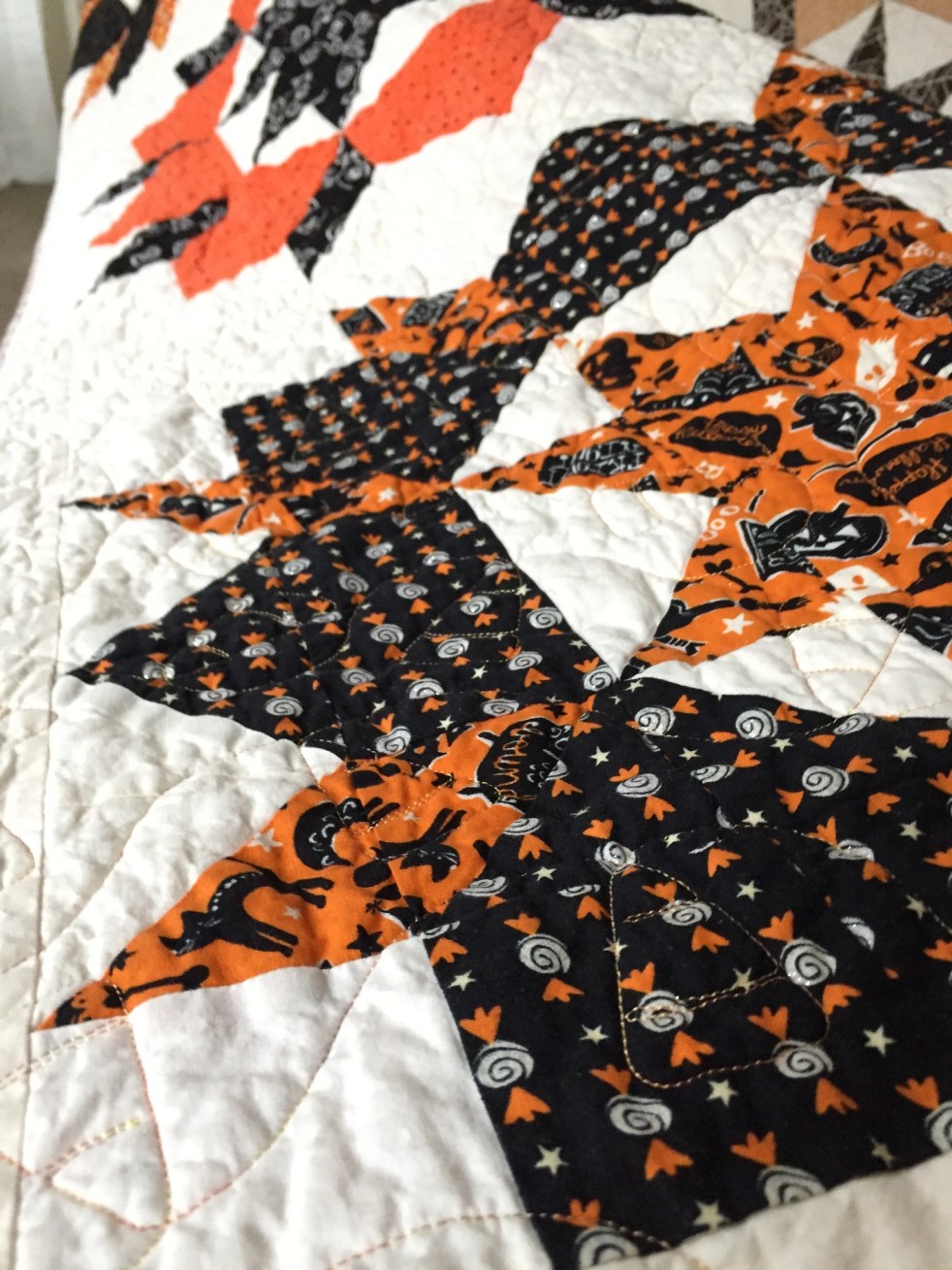 What does an empty nest mom do when Halloween comes along? I decided to make a quilt. Of course the theme would be spooky and the pattern bold. I had a stash of fabric and the will to craft it into something special. I felt a little forlorn with the weather changing and no little… Continue reading The Swoon Halloween quilt